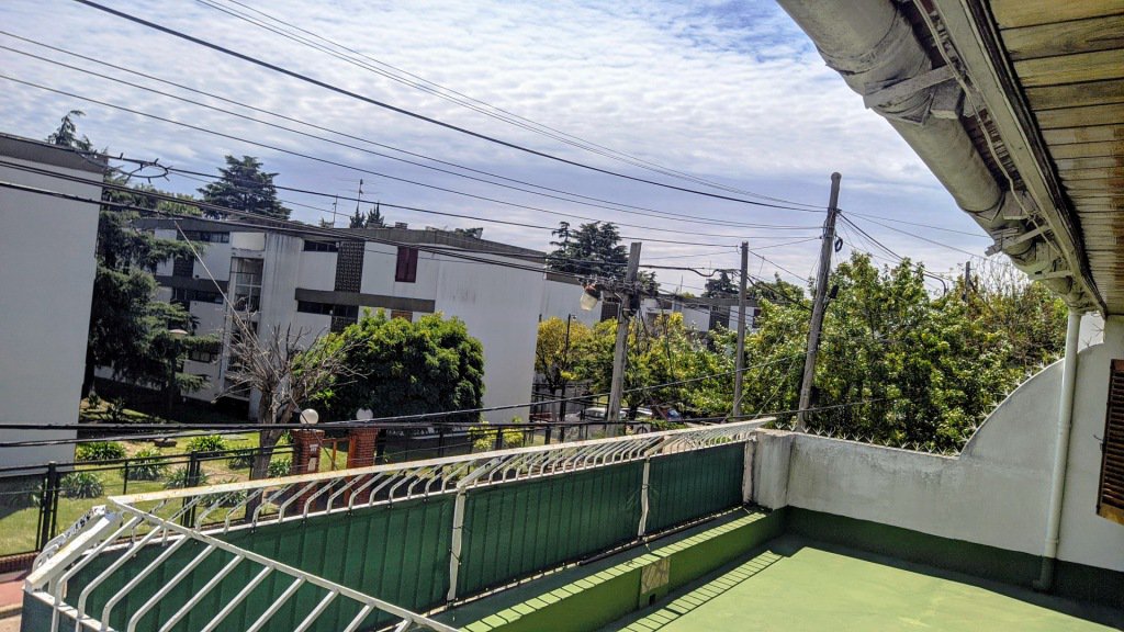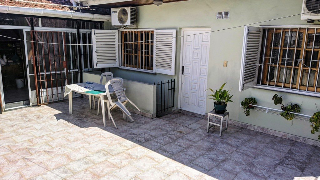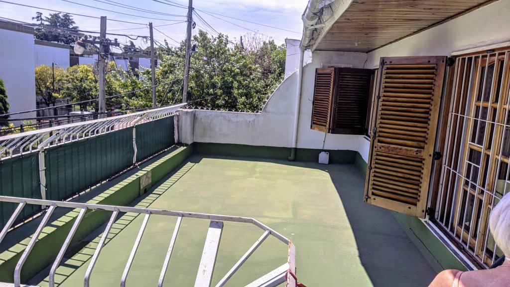 un Amplio balcon terraza al frente y un patio trasero con lavadero, parrilla y baño.